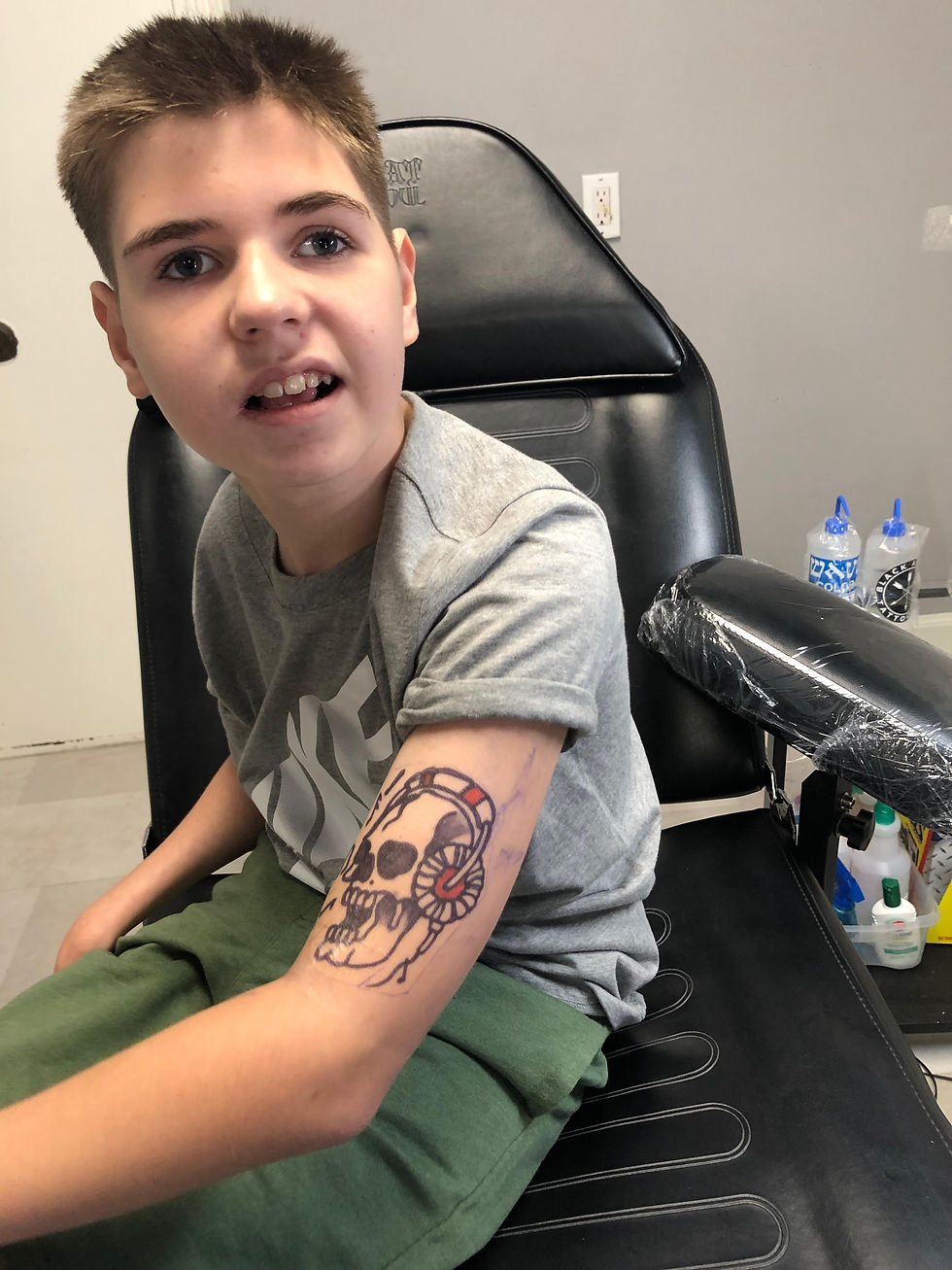 Landon, at 12 years old, decided a tattoo was something he wanted to experience in life. Little did they know, Black Arrow was well equipped to make this happen for him, in a safe and enjoyable way. Being different and wheel chair bound wasn't about to detach him from the spark you would find within any 12 year old boy. Life couldn't throw anything at Landon that he wouldn't just knock out of the park and beyond. Nothing could kill his spirit.